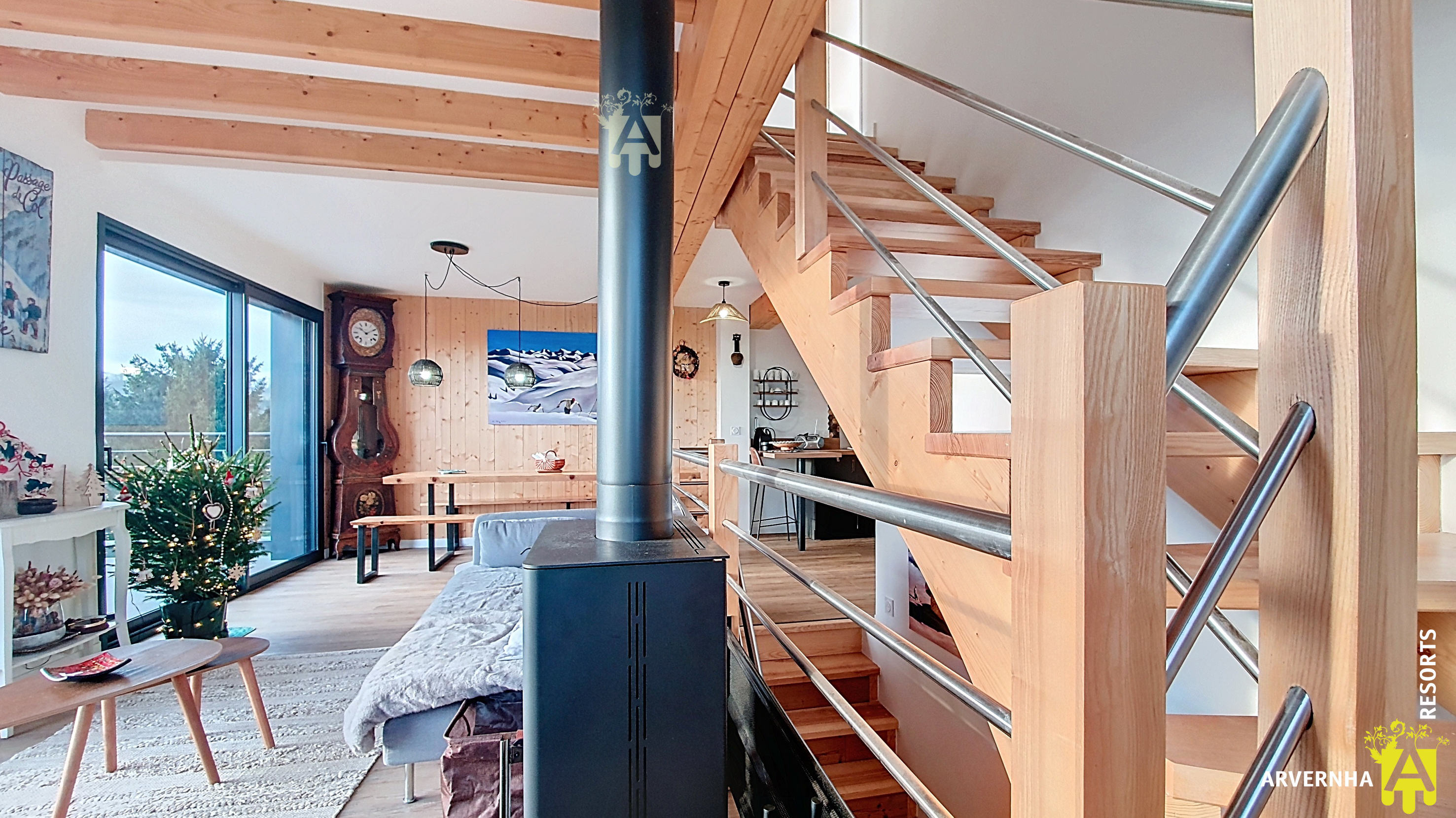 L’espace de vie offre une atmosphère particulièrement chaleureuse grâce à un poêle à bois, parfait pour partager des moments conviviaux en famille ou entre amis après une journée en pleine nature ainsi que grâce à son balcon offrant une vue idéale pour un coucher de soleil mémorable.